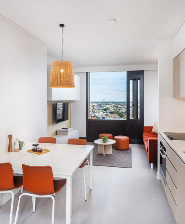 편안하고 안전한 학생 라이프스타일을 위해 설계된 개인 원룸이나 넓은 아파트 중에서 선택하세요. 전용 스터디 공간, 헬스장, 사교 공간, 야외 마당 등 필요한 모든 시설을 갖추고 있습니다.
